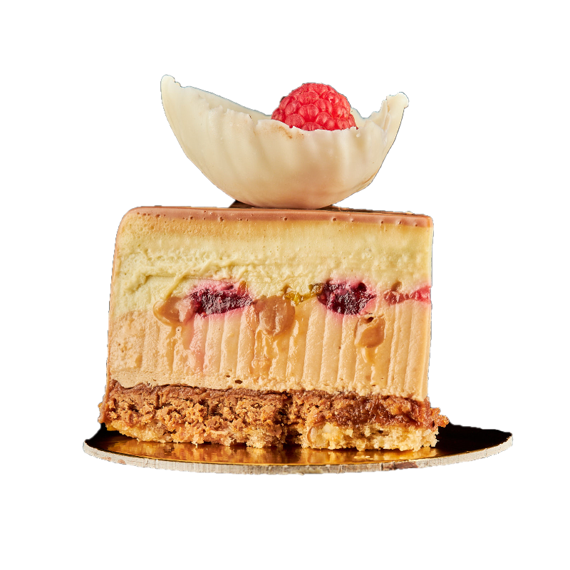MOUSSE FISTIC, MOUSSE CARAMEL, INSERTIE DE ZMEURA SI DE CARAMEL, BLAT DE CACAO, CROCANT DE PRALINA.